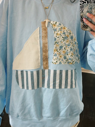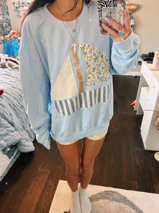 The patchwork is hand sewn onto the front of the sweatshirt!As you wash this sweatshirt the edges of the design will start to fray and look more worn in!